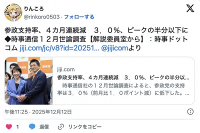 【ネトウヨ悲報】参政党支持率、4カ月連続減 3.0%、ピークの半分以下に◆時事通信12月世論調査