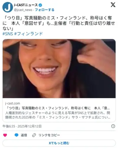 【つり目ฅ(◝𖥦◜)ฅジェスチャー】ミス・フィンランド、称号はく奪!