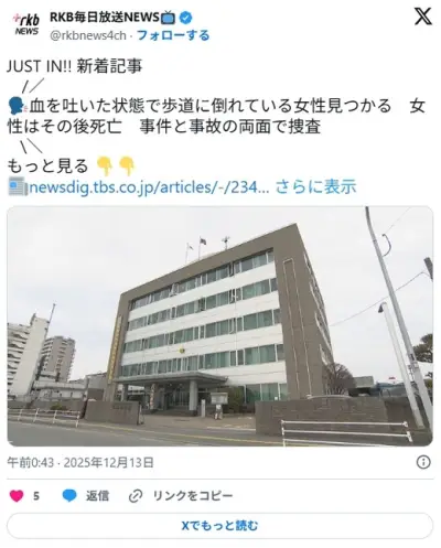 【福岡】「50歳くらいの男性が倒れている」血を吐いた状態で歩道に倒れている女性見つかる 女性はその後死亡 事件と事故の両面で捜査