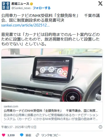 公用車カーナビのNHK受信料「全額免除を」 千葉市議会、国に制度創設求める意見書可決