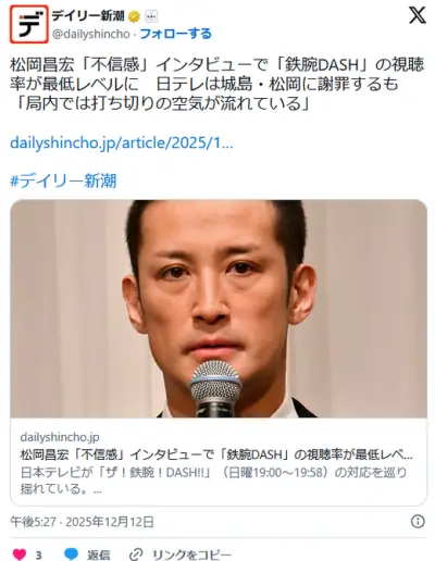 「鉄腕DASH」の視聴率が最低レベルに 日テレ「局内では打ち切りの空気が流れている」