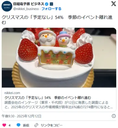 クリスマスの「予定なし」54%