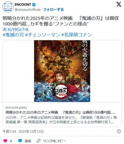 【アニメ】明暗分かれた2025年のアニメ映画 『鬼滅の刃』は興収1000億円超… 一方で『果てしなきスカーレット』厳しいスタート