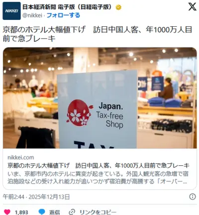 京都のホテル大幅値下げ 訪日中国人客、年1000万人目前で急ブレーキ