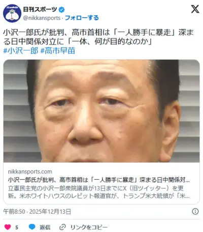 立憲・小沢一郎氏「今回の件は、高市総理が一人勝手に暴走し、対立を激化させている」