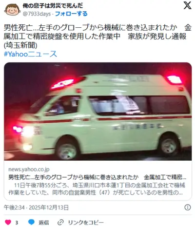 旋盤でグローブを使った素人が巻き込まれて死亡。旋盤やドリルで手袋使うな。