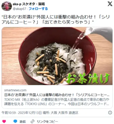 外国人、お茶漬けに不快感 「だって米にお茶かけているんだぞ?食べ物だと思う?」