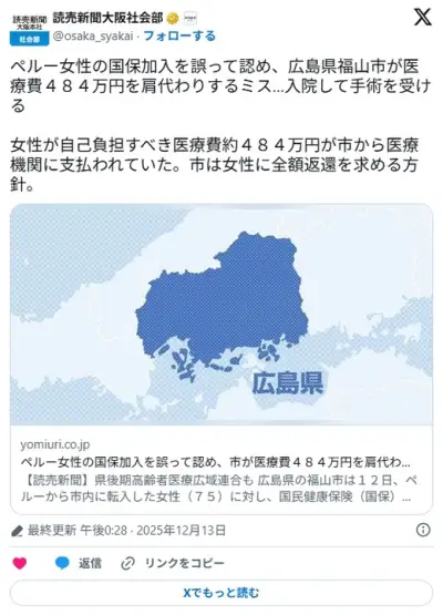 【広島】ペルー女性の国保加入を誤って認め、福山市が医療費484万円を肩代わりするミス…入院して手術を受ける