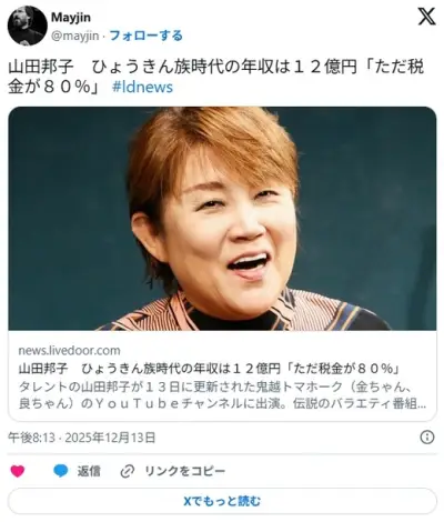 山田邦子 ひょうきん族時代の年収は12億円「ただ税金が80%」