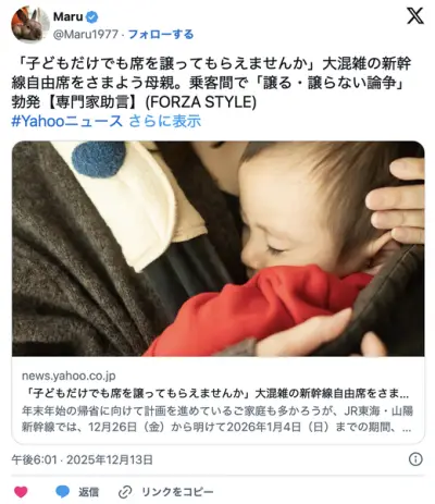 【子どもだけでも席を譲って】大混雑の新幹線自由席をさまよう母親に「譲る・譲らない論争」勃発へ