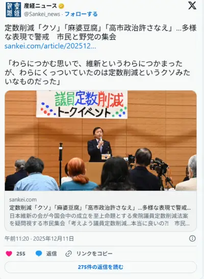 立憲・奥野氏「なぜ議員削減数は1割なんだ?」→高市首相「民主党が1割が良いと言ってたので」