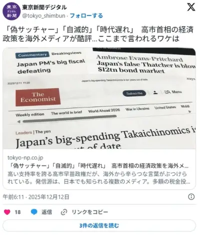 「偽サッチャー」「自滅的」「時代遅れ」 高市首相の経済政策を海外メディアが酷評
