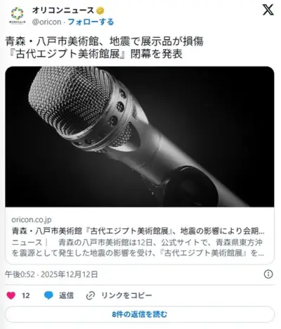 青森・八戸市美術館『古代エジプト美術館展』、12月8日に発生した地震の影響により会期途中で閉幕を発表「展示品数点に損傷が確認」