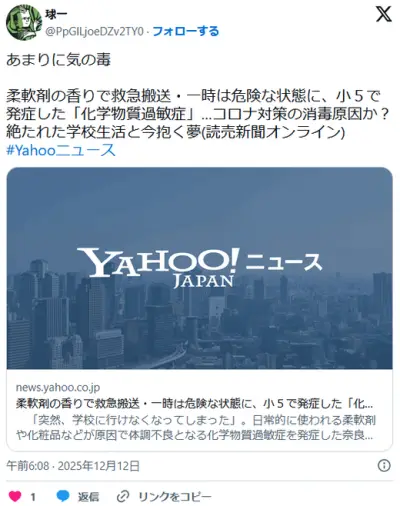 【化学物質過敏症】柔軟剤の香りで救急搬送・一時は危険な状態に…コロナ対策の消毒原因か?