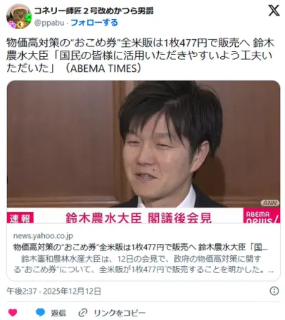 【おこめ券】物価高対策の“おこめ券”全米販は1枚477円で販売へ 鈴木農水大臣「国民の皆様に活用いただきやすいよう工夫いただいた」