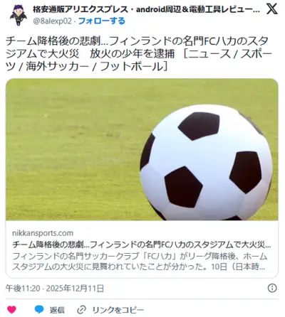 【サッカー】チーム降格後の悲劇…フィンランドの名門FCハカのスタジアムで大火災 放火の少年を逮捕