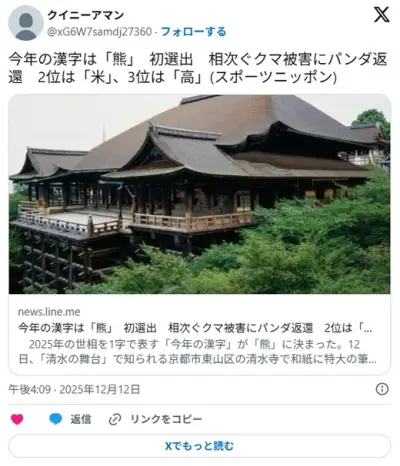 今年の漢字は「熊」に決定! 相次ぐクマ被害 去年は「金」