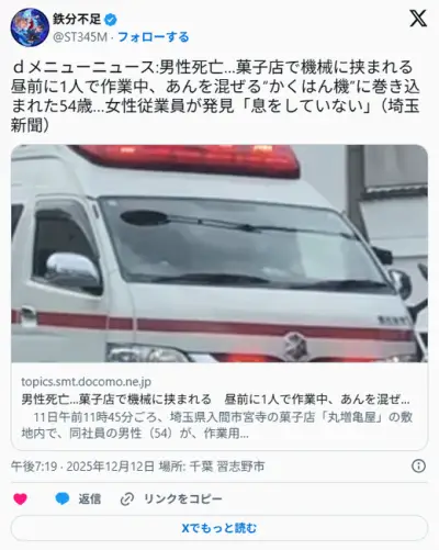 【埼玉】54歳男性死亡…菓子店で機械に挟まれる 昼前に1人で作業中、あんを混ぜる“かくはん機”に巻き込まれ…女性従業員が発見 入間