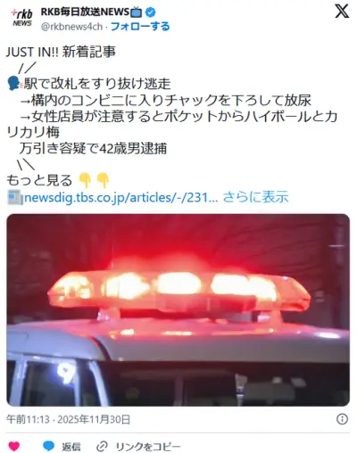 【大牟田】駅構内のコンビニに入り放尿→女性店員が注意するとポケットからハイボールとカリカリ梅 万引き容疑で42歳男逮捕