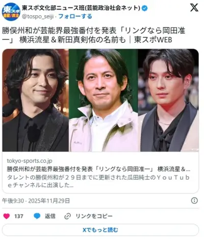 芸能界ケンカ最強番付を発表「リングなら岡田准一」 横浜流星&新田真剣佑の名前も 1番強いのは誰か