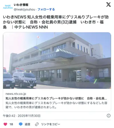 知人の車のブレーキにグリスを塗布→器物損壊で逮捕