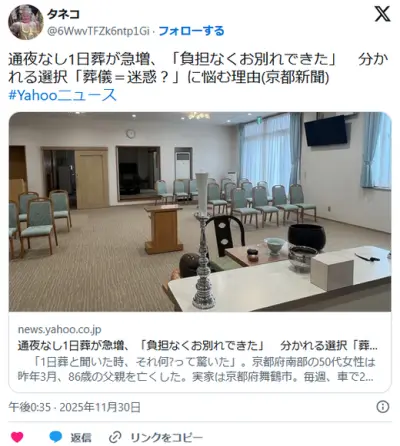通夜なし1日葬が急増、「負担なくお別れできた」 分かれる選択「葬儀=迷惑?」
