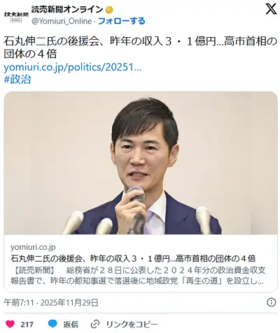 石丸伸二氏の後援会、昨年の収入3・1億円…高市首相の団体の4倍