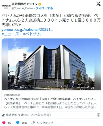 【おこめ】ベトナムから密輸のコメを「国産」と偽り販売容疑、ベトナム人ら2人追送検…300トン売って1億3000万円稼いだか 大阪