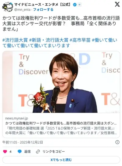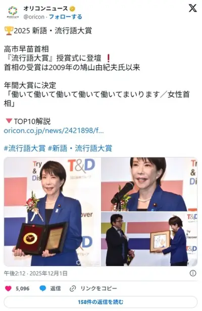 【速報】流行語年間大賞に高市早苗首相「働いて働いて働いて働いて働いてまいります/女性首相」