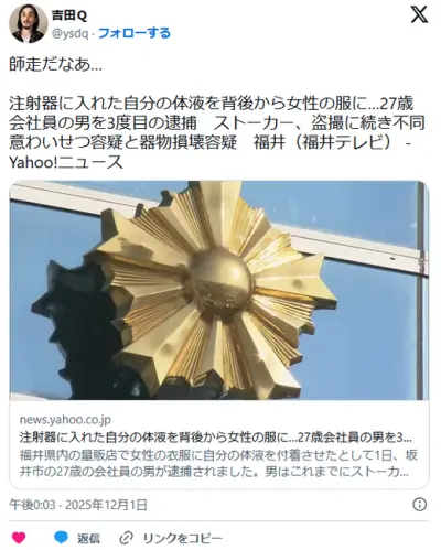 【福井】注射器に入れた自分の体液を背後から女性の服に…27歳会社員の男を3度目の逮捕
