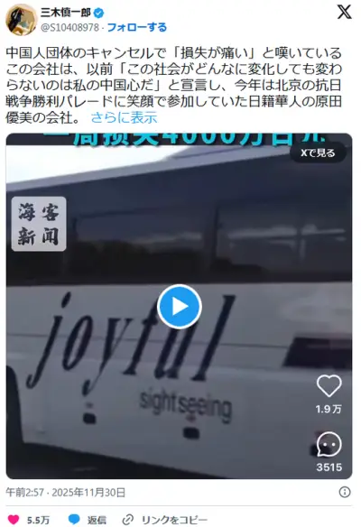 日籍華人「中国人団体のキャンセルで損失が痛い」