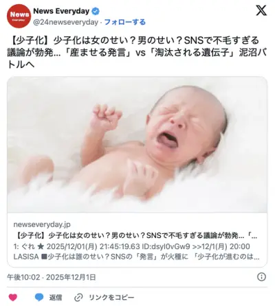 【少子化】少子化は女のせい?男のせい?SNSで不毛すぎる議論が勃発…「産ませる発言」vs「淘汰される遺伝子」泥沼バトルへ