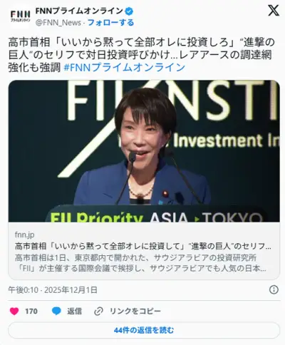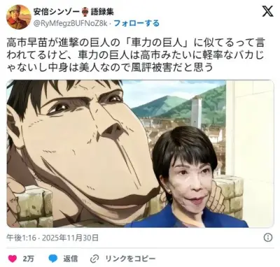 高市早苗さん、突如エレン・イェーガーになる 「いいから黙って 全部私に投資して」