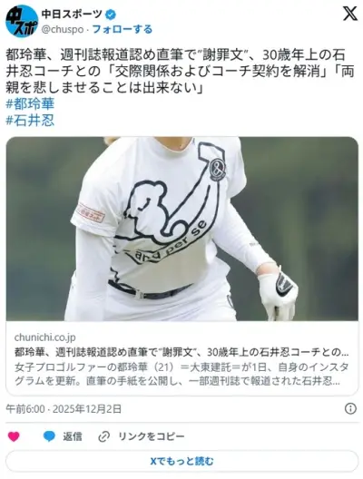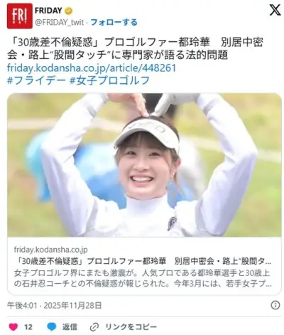 【女子ゴルフ】都玲華(21)30歳年上の既婚者コーチとの交際関係とコーチ契約解消「昨年からお付き合いしてました。」