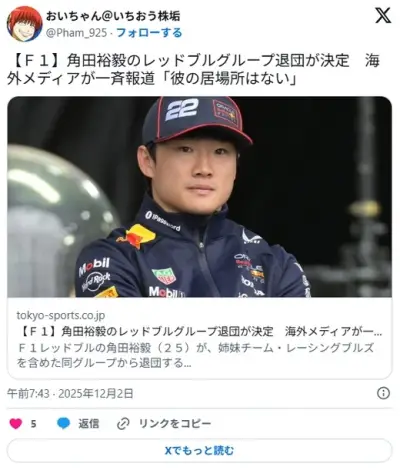 【F1】角田裕毅のレッドブルグループ退団が決定 海外メディアが一斉報道「彼の居場所はない」