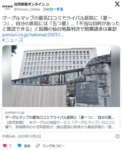 【訴訟】グーグルマップの匿名口コミでライバル医院に「星一つ」、自分の医院には「五つ星」…損害賠償訴訟で仙台地裁判決