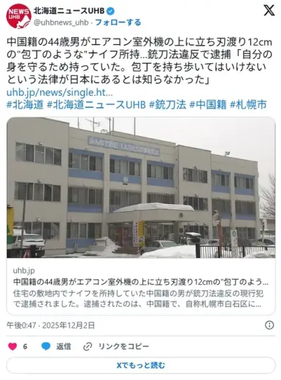 室外機の上に立っていた中国籍の男(44)逮捕「包丁を持ち歩いてはいけないという日本の法律は知らない」
