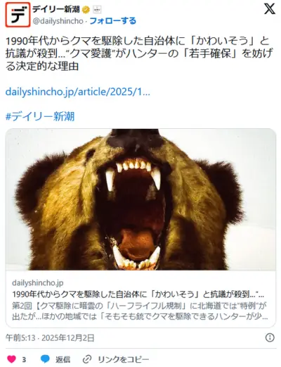 1990年代からクマを駆除した自治体に「かわいそう」と抗議が殺到…“クマ愛護”がハンターの「若手確保」を妨げる決定的な理由