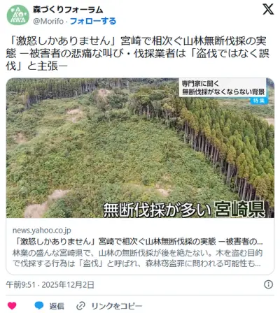 【🌲】「激怒しかありません」宮崎で相次ぐ山林無断伐採の実態 ー被害者の悲痛な叫び・伐採業者は「盗伐ではなく誤伐」と主張ー