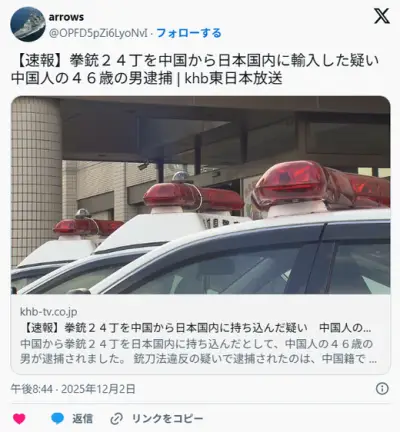 【速報】中国人の男、「拳銃24丁」を中国から日本国内に持ち込んだ容疑で逮捕