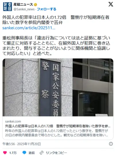 外国人の犯罪率は日本人の1.72倍 警察庁が短期滞在者除いた数字を参院内閣委で答弁