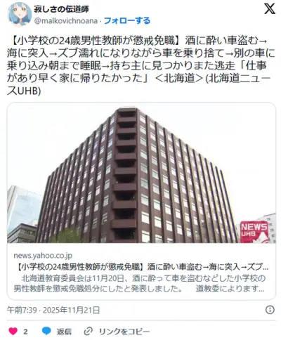 教師を懲戒免職 5軒はしご→車を盗む→道に迷い車水没→他の車の中で眠る