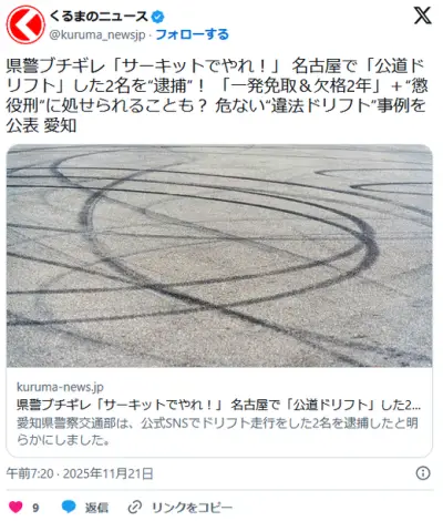 【名古屋】愛知県警ブチギレ「サーキットでやれ!」 公道ドリフトした2名を逮捕