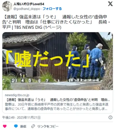 【長崎平戸】強盗未遂は「うそ」 通報した女性の"虚偽申告”と判明 理由は「仕事に行きたくなかった」