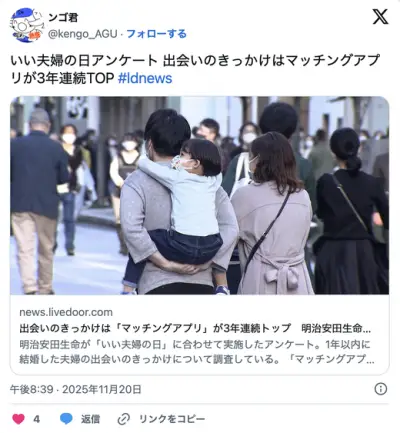 【悲報】日本さん、結婚したカップルの出会いがマッチングアプリの1位の時代へ。いよいよ末期