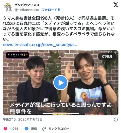 石丸伸二「クマ被害は田舎の人以外関係ない。都会の人にとってはエンタメ(笑)」