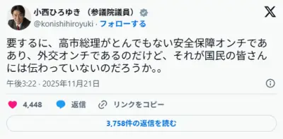 小西ひろゆき『高市総理はとんでもない安全保障オンチであり外交オンチであるのだけど伝わってない?』