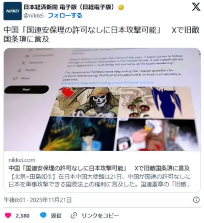 中国「国連安保理の許可なしに日本攻撃可能」 Xで旧敵国条項に言及…