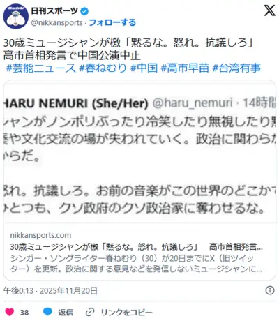 日本人30歳歌手、中国公演中止に怒り「黙るな。怒れ。抗議しろ。糞政府(日本)の糞政治家(高市)に」