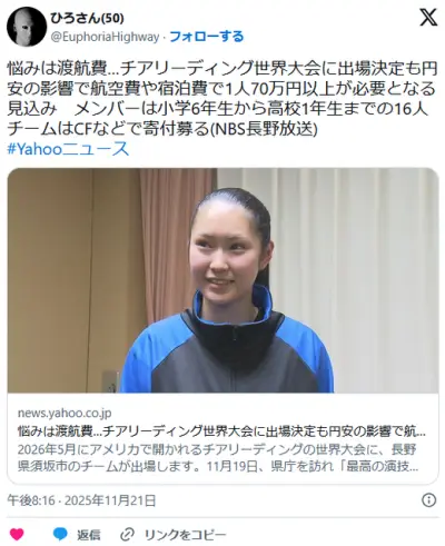 《悩みは渡航費》チアリーディング世界大会に出場決定も… 円安で航空費や宿泊費で1人70万円以上が必要 クラファンなどで寄付募る